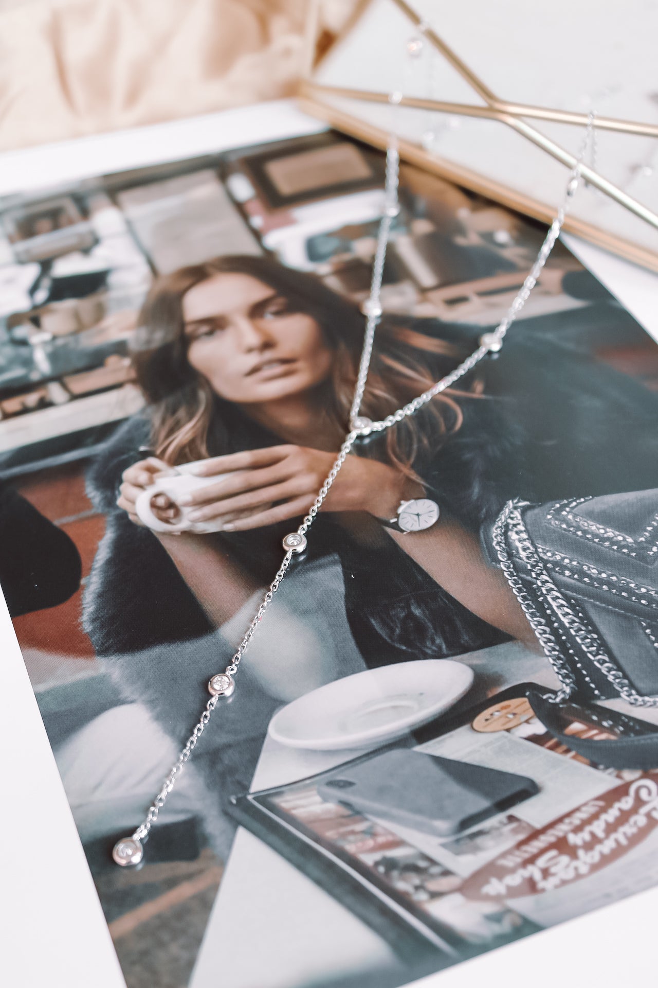 Su silueta tipo lariat o cascada aporta un toque elegante y distinguido, ideal para realzar el escote y complementar looks tanto de día como de noche.
