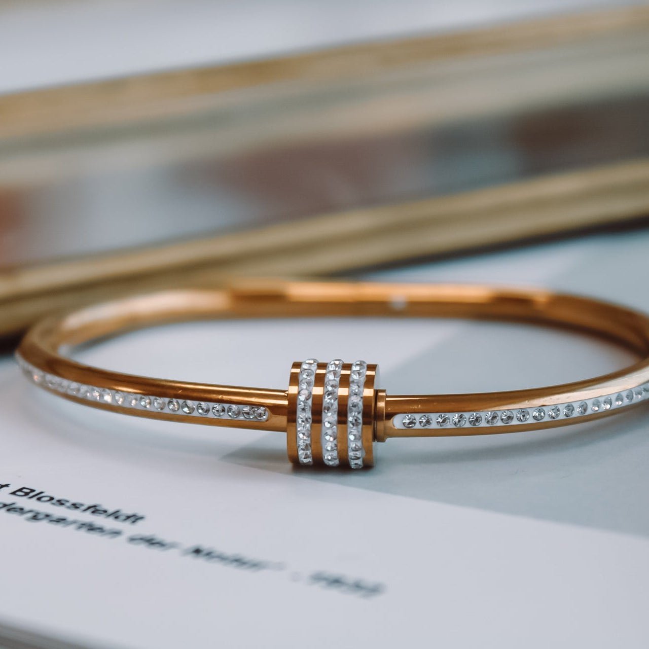 Combina elegancia y modernidad en una pieza llena de luz. Destaca por su detalle central con tres filas de circones, creando un efecto brillante y sofisticado que eleva cualquier look.