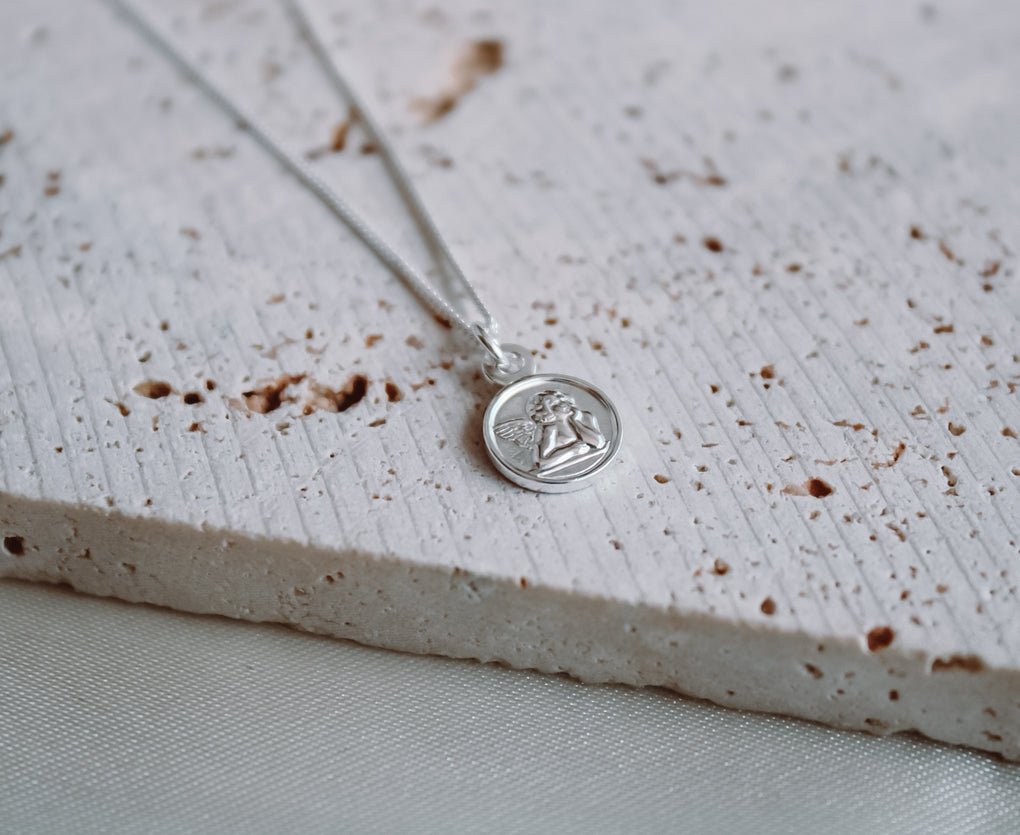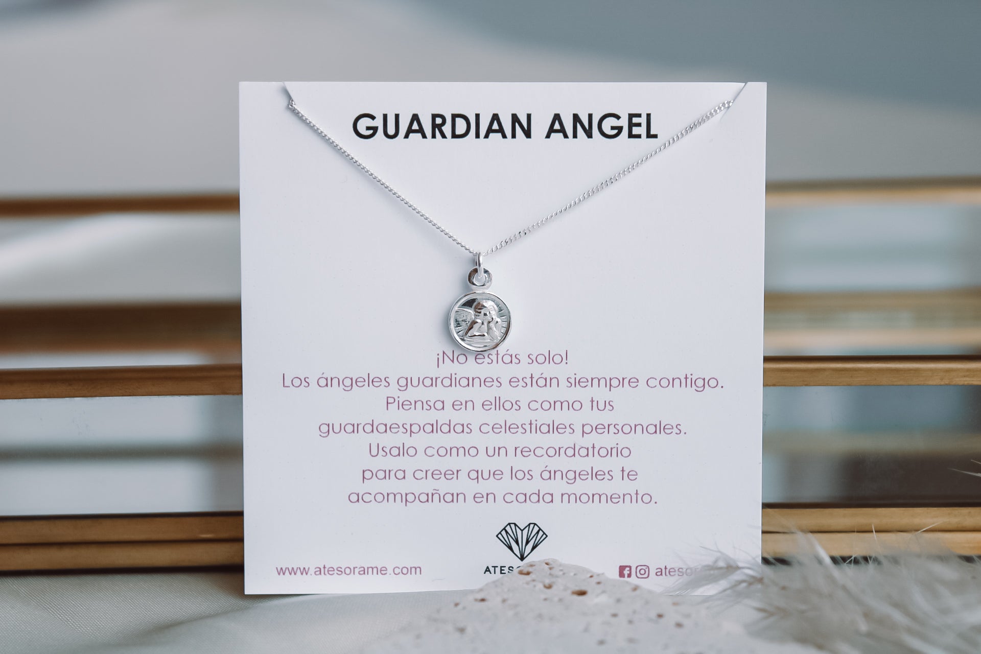 El Collar Ángel de la Guarda Petite está elaborado en plata ley 925 y presenta una delicada medalla con la figura del ángel protector, un amuleto clásico que representa cuidado, fe y resguardo.