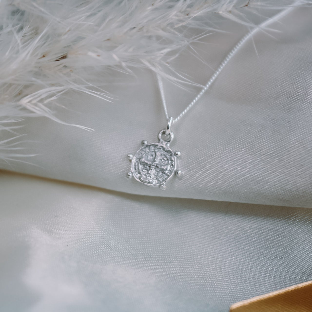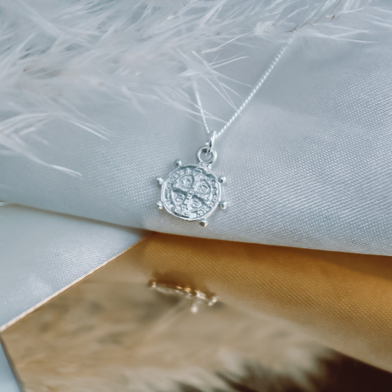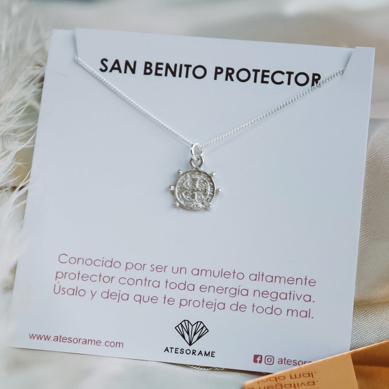 Collar Amuleto San Benito – Un símbolo de protección y fortaleza espiritual. Este collar, elaborado en plata de ley 925, lleva la medalla de San Benito, conocida por ser uno de los amuletos más poderosos contra las malas energías y todo tipo de peligros. Representa la fe, la protección divina y el resguardo frente a las adversidades del día a día.