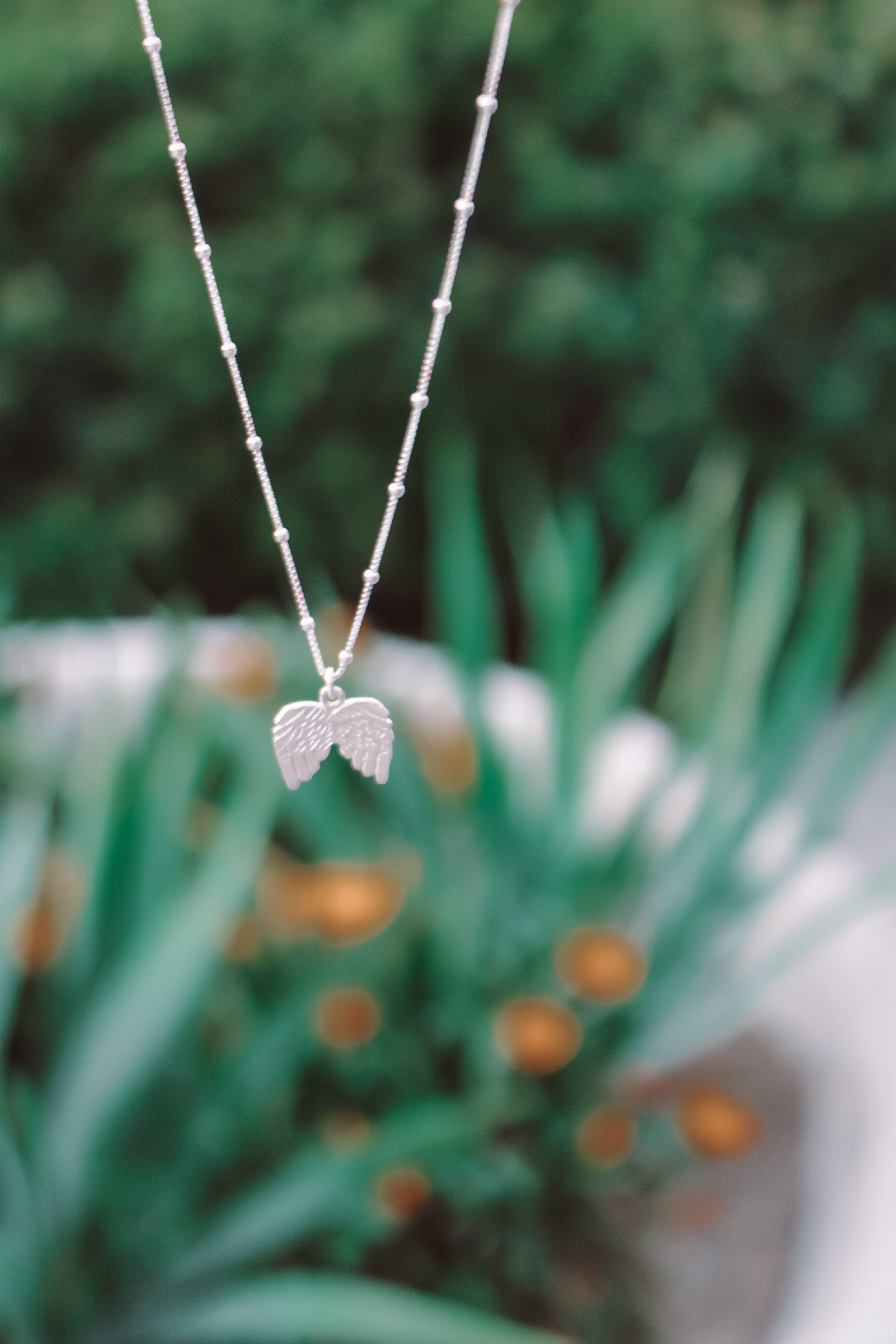 Amuleto protector de plata de Ley 925, cadena de bolitas y alas de angel.