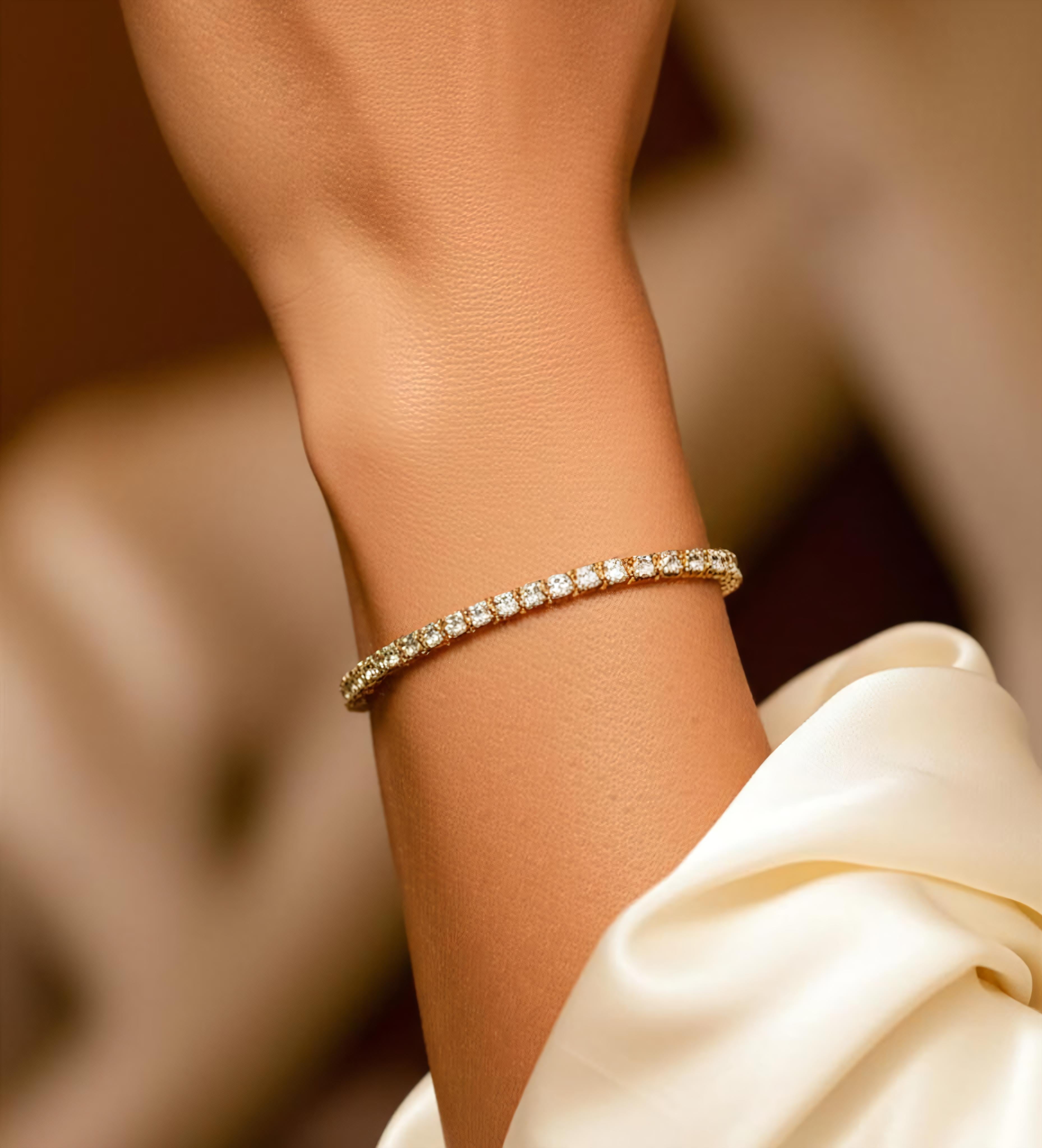 Delicada, elegante y en total tendencia. La Pulsera Tennis Gold está diseñada con circones de 3 mm que entregan un brillo sutil y sofisticado, perfecta para elevar tu look con un toque de luz. Su formato elasticado la hace cómoda y fácil de usar todos los días.